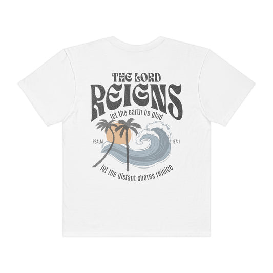 Back Print Christian Summer Beach Tee, Jesus Crewneck Surf Shirt, Let the Earth Be Glad Psalm 97:5 Unisex Garment-Dyed T-s